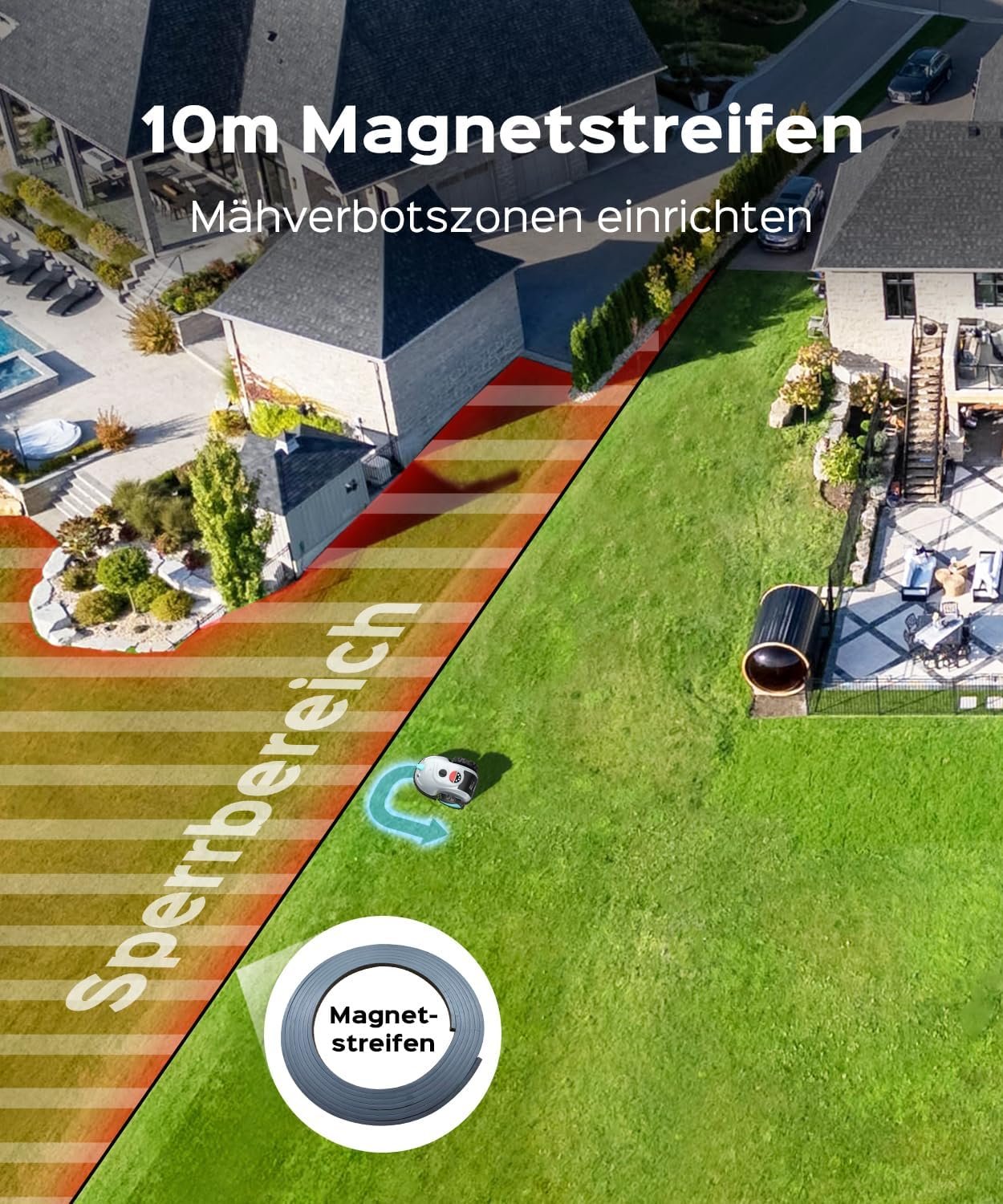 • Intelligente Hinderniserkennung: Ausgestattet mit Kollisions- und visuellen Sensoren navigiert der Roboter präzise per Kamera. Er erkennt bis zu 150 verschiedene Hindernistypen. Für Bereiche mit unklaren Rasengrenzen liegt ein Magnetband zur präzisen Abgrenzung bei.
