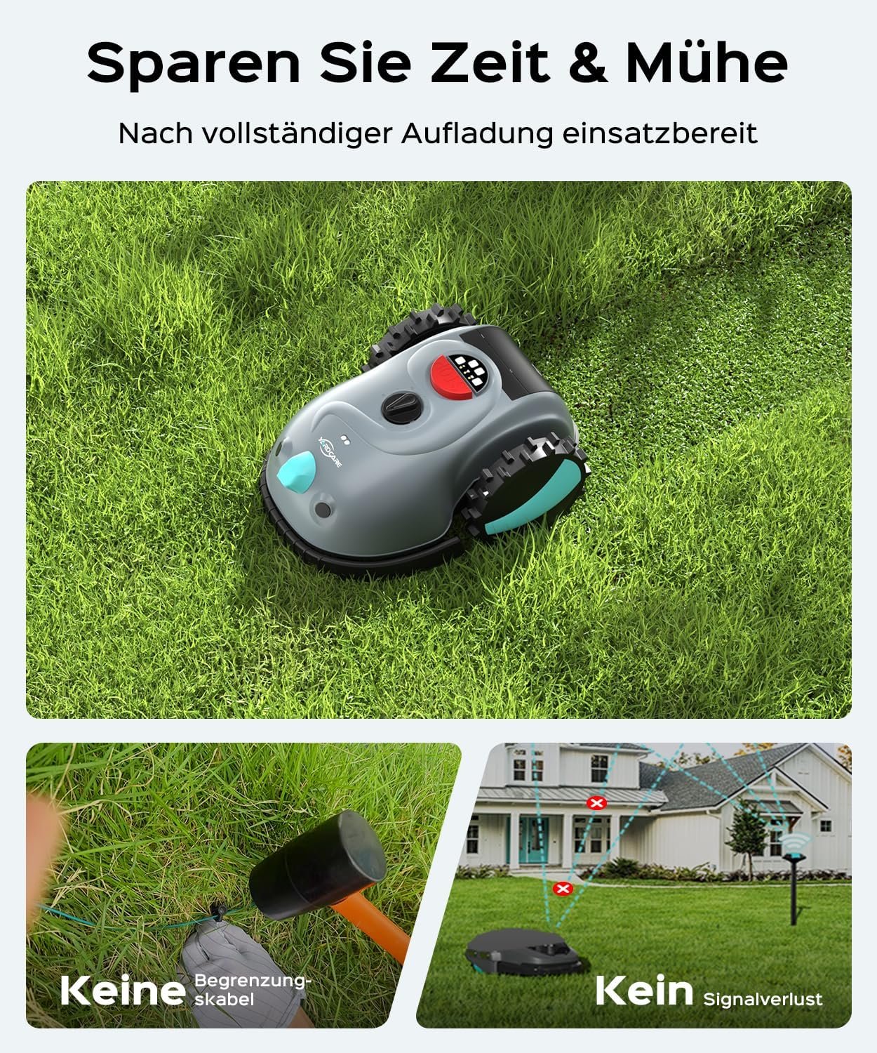 • Zeitsparendes Design: Der V100 benötigt keine Begrenzungskabel oder komplizierte Drahtverlegungen. Er ist sofort einsatzbereit – einfach den mitgelieferten 4-Ah-Akku einsetzen und die automatisierte Rasenpflege starten.